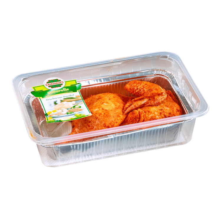11101 | 1/2 Hähnchen gewürzt in Aluschale | Schale | 4 | 2,6 | 6 | 0,650 |