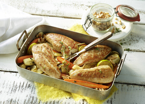 In der Zwischenzeit Walnüsse grob hacken, etwa 5 Minuten vor Ende der Garzeit über das Gericht streuen und mitrösten.Putenbrustfilets auf Pastinaken-Karottengemüse mit Walnüssen im Bräter servieren und genießen.